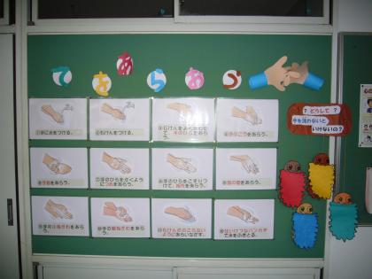 保健室の掲示板です。手の洗い方の説明が、絵と文でわかりやすく書いています。みのむしの裏にもいろいろな注意が書いてあるので、子供たちは楽しみながら読んでいます。