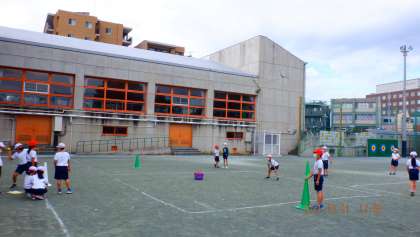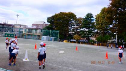体育の学習で、ベースボール型のゲームの学習をしています。今回は、様々な経験をしてほしいと思い、1組と2組で蹴るゲームと投げるゲームに分かれて取り組んでいます。ルールはほぼ同じですが、子どもたちはそれぞれの学級の体育の違いを見つけ、「蹴るよりも遠くに飛ばすぞ!」「投げるよりも正確に飛ばすんだ!」と、意気込んでいます。