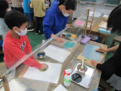 最初に刷り方の説明動画(教員の自作映像)を視聴して、活動のイメージをつかみました。そして、活動に必要なものを準備して、早速、「自分色」を考えて色づくりをし、ブラシ刷りで作品を仕上げていました。また、友達と作品を見合いながら、さらに「自分色」をつくり、2枚目、3枚目の作品づくりを楽しんでいました。