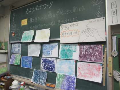 今日の学習のめあては「自分色をつくり、版を刷ることを楽しもう。」と「どんな色で刷りたいかを考え、色づくりをしよう。」の2つでした。