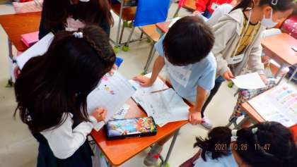 3年生は、現在外国語活動で「What do you like?」の学習をしています。今回は、自分の好きなものを友達の紹介する活動をしました。子どもたちは、習った表現を使って楽しんでインタビューやそれに応える活動をしました。