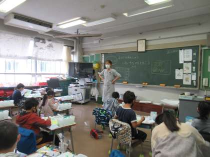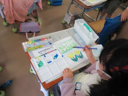 今日の図工の時間では、絵の具の使い方を学習しました。絵の具をパレットに出して、筆で広げてみたり、バケツで筆を洗ってみたり、新しいことをたくさん学習しました。今日は、黄色と青色の2色の絵の具を使いました。同じ色の絵の具を使っているのに、パレットに混ぜながら広げてみると全員が同じ色にはなりません。水や絵の具の量によって、黄緑色や緑色など様々な色ができ不思議そうにしている半分、とても嬉しそうな様子でした。