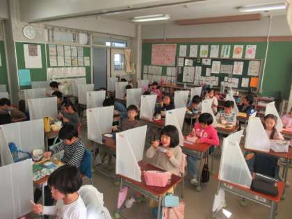 *写真は、2年生3学級の今日のお弁当の時間の様子からです。