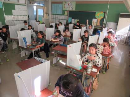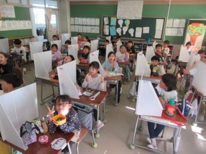 9月初旬からお弁当をもって登校して来た子どもたちの生活も、いよいよ今日で最終日となりました。子どもたちは、お家で準備していただいたお弁当をおいしくいただき、2か月間過ごしてきました。今日の朝に配布された献立表を見て給食への期待を膨らませている子どもたちですが、口々にお家の方々への感謝の気持ちも述べていました。