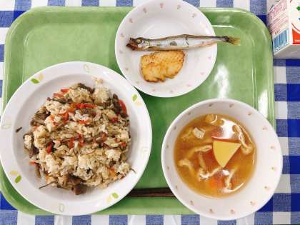 11月8日は、「いい歯」のごろ合わせで「いい歯の日」です。そこで、今日はごぼうやこんぶ、ししゃもにいかなど、かみごたえのある食材をたくさんつかった「かみかみ給食」にしました。