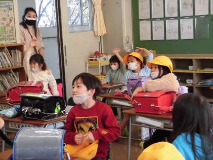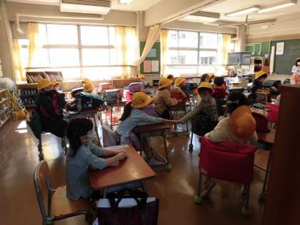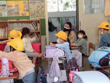 帰りの会で紹介をして、1年生と一緒に席について帰りの会をしました。さようならをしたら、3組の友達とコミュニケーションをとりながら下校コースに並んで一緒に下校しました。