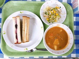 木々が紅葉してくると、お弁当をもって紅葉狩りに行きたくなりますね。今日はお弁当にぴったりのサンドイッチをつくりました。白いパンにはブルーベリージャムを、茶色いパンにはクリームチーズをはさんでいます。1枚1枚調理員さんがていねいに塗ってくれました。