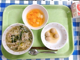 今日は学習学芸発表会をがんばっているみなさんへの応援の気持ちを込めて、人気メニューのラーメンをつくりました。また、いつものフルーツポンチにひと手間加えて、もちもちの白玉を加えたフルーツ白玉もつくりました。一生懸命に声をだしたり、お友達の発表を真剣に聞いたりしていると、思っている以上におなかがすきます。しっかり食べて、明日もがんばってください!