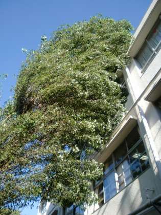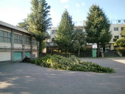 9月21日(水)に日本列島を縦断した台風15号の影響で、校内にあるポプラの木が倒れてしまいました。校庭の図書室前にあった2本のうち、1本は根元から倒れ、もう1本は根元に地割れができていました。また、中庭の大きなポプラは北校舎に寄りかかるようにして傾いてしまいました。できるだけ残したいと考えましたが、倒れた、また倒れ掛かっている2本は切ることにし、地割れをおこしているものは上の枝を切り取り、何とか生かしていくことにしました。