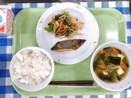 今日は魚、野菜、海草、きのこ、豆腐などをつかった、和食の献立です。すまし汁は昆布とかつおのだしで、じっくりうまみを引き出しました。魚の西京焼きは、和食の代表的な調味料であるみそをつかっています。