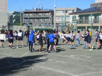 各学級の長縄を使って、校庭いっぱいに広がり、長縄跳びを約10分間程、全校一斉に楽しみました。跳び終えた子どもたちからは、笑顔がいっぱい、あふれていました。