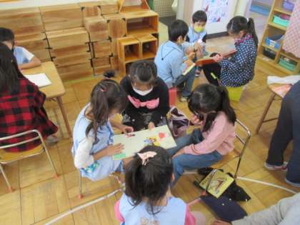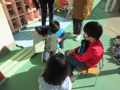 年少組のみなさんに向けて、絵本の向きを考えたり、聴きやすく読んだりと、工夫して一生懸命にお話を読んでいました。年少組のみなさんも、嬉しそうに聴き入っていました。