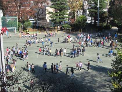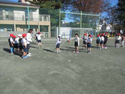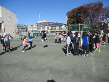 2時間目の学習を終えた子どもたちが校庭に出てきて、学級ごとに長縄跳びを楽しみました。声をかけ合ったり、回数を数えたりしながら、音楽が流れる中で約10分間、みんなで一緒に運動しました。