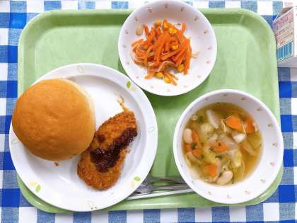 今日のサラダには、にんじんがたくさん入っています。にんじんは、色の濃い緑黄色野菜と言われます。「カロテン」という栄養が豊富で、これは風邪予防に大きな力を発揮してくれます。それだけでなく、目や肌も健康にしてくれる優秀な野菜です。