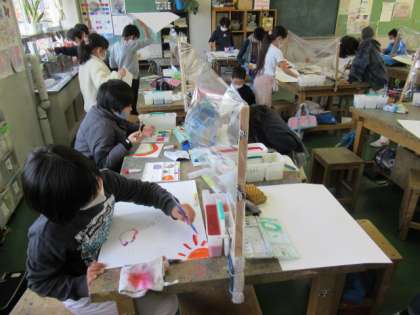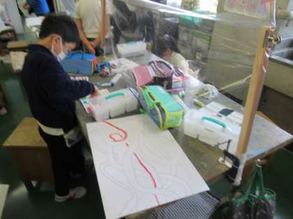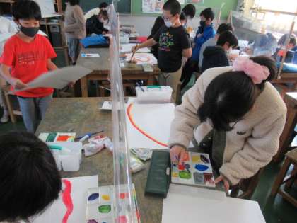 虹にさわれたら、どんなことがしたいか考えて絵に表わそう、というめあてで学習していました。赤・青・黄色の3原色を使って、混ぜ方に気を付けながら色を作っていました。細い虹、太い虹、波をうっている虹、ぐるぐる回転している虹・・・思い思いの虹ができあがっていました。友達の作品を見て、参考にしている人もいました。