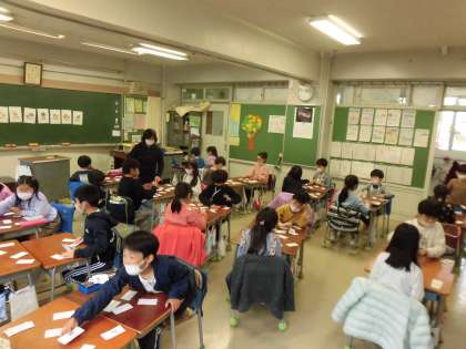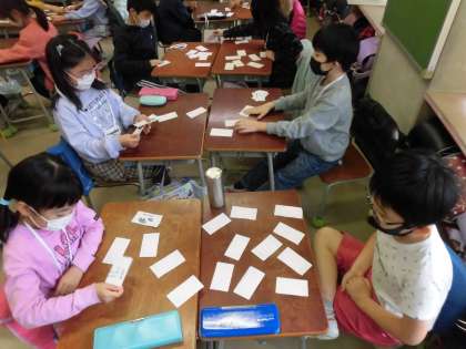 最後に友達と動物のカードを使って神経衰弱をしました。「また引き分けだ。」「猿だからモンキーだ。」「これはライオン!だと思ったらコアラ!」など楽しんで発音を覚える声が教室に響いていました。