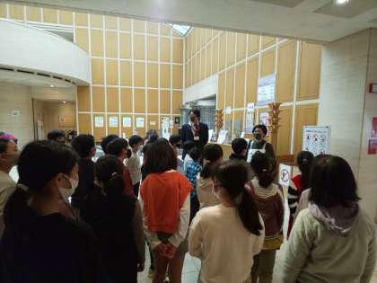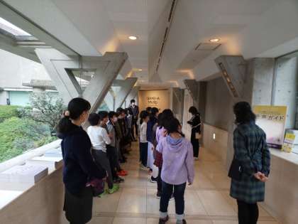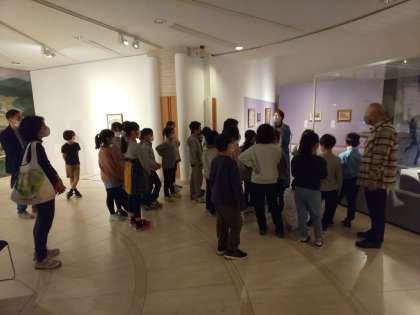4年生のみなさんは、今、世田谷美術館に来ています。世田谷区立小学校4年生を対象に実施している美術鑑賞教室です。美術館の学芸員の方々と鑑賞リーダーの方々に案内していただき、作品を鑑賞しています。子どもたちは、関心をもって鑑賞したり、質問したりして学習しています。