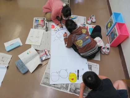 「上のほうは、僕がやるから下のほうはよろしく。」、「色塗りできるところからやっておくよ。」と、友達と協力しながら取り組んでいます。