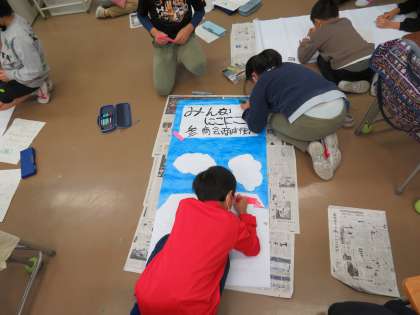 4年生は、総合的な学習の時間に参商会商店街のバナー作りをしています。