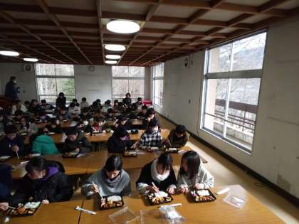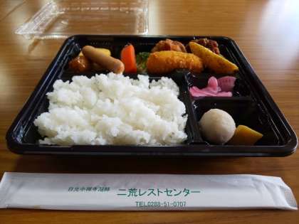 先程、昼食とふくべ細工体験場所の二荒レストセンターに着きました。