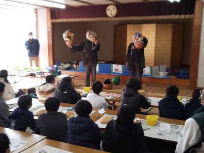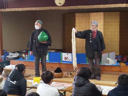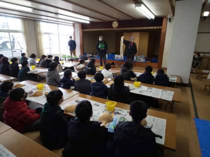 講師の先生から、最初に栃木県名産のかんぴょうについて話を聴きました。また、伝統工芸品のふくべ細工とその作り方について教えていただきました。