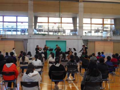 今日は、いつも使っている体育館がコンサートホールとなり、弦楽器の素敵な音色が響き渡りました。