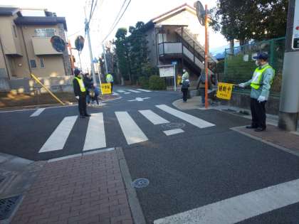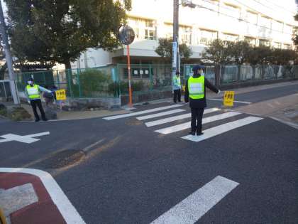 初日となった今朝の登校時に、正門近くの南側交差点でビブスを着用した4名の方々が、子どもたちへの朝のあいさつの声かけとともに、横断歩道での旗振りと安全の確保をしてくださいました。通勤・通学の自転車の通行に配慮して、子どもたちの安全を確保してくださっています。