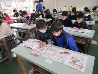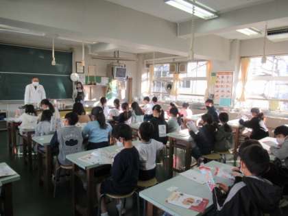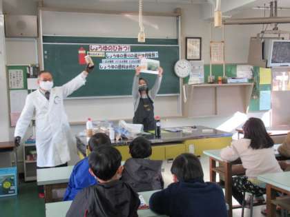 本日、2学期に国語で学習した「すがたをかえる大豆」の続きで、しょうゆについての学習をしました。講師には、キッコーマンの方に来ていただき、しょうゆの作られ方や製造工程でできるものを実際に見る体験をしました。