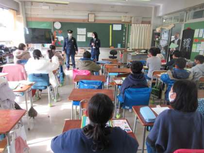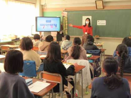 写真は、臨床検査技師、美容師、世田谷警察署警察官として、病院、美容室、警察署で仕事をしている講師の皆様が講話をしている一場面です。