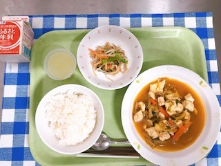 麻婆豆腐よりは少し辛いですが、給食では、みんなが食べられるように辛さを調節して作っています。白いごはんと一緒に食べると、とてもよくあいますよ。