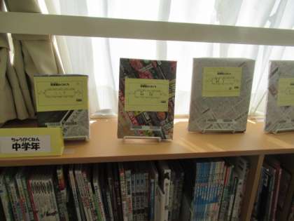 低学年・中学年・高学年向けの本が福袋に包まれ、包みの中の本のヒントが書かれた紹介カードが貼られているだけで、どのような本なのか見ただけでは分かりません。