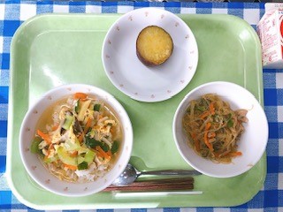 今日は韓国料理のメニューです。クッパはご飯にスープをかけた料理で、日本でいうお茶漬けのようなものですね。チャプチェは春雨をつかった炒め物です。デザートは焼きいもです。今日のさつまいもは「紅はるか」という種類のさつまいもです。紅はるかは「ほくほく」というよりは「しっとり」とした食感で、とても甘くておいしいですよ。