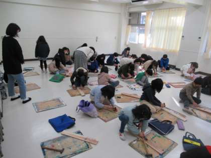 今回も保護者の「釘打ち見守りボランティア」の皆様の支援やアドバイスを受けながら、楽しく安全に製作活動に取り組む子どもたちでした。