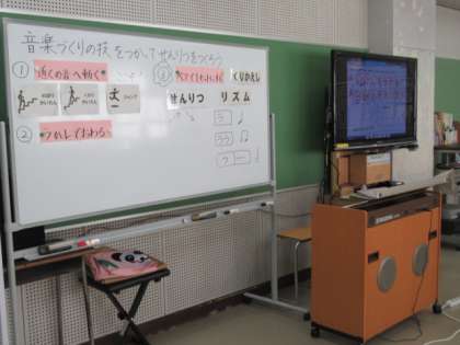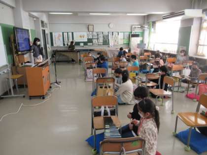 今日の4時間目の音楽室では、4年1組のみなさんが前時の学習に続いて「日本の音楽とつながろう」の学習に取り組んでいました。