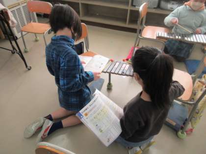 ペアで即興的に旋律を演奏したり、反復を用いて思いや意図をもったりして、8小節のまとまりのある旋律をつくっていました。つくった旋律を学習シートにまとめ、仕上げていきました。