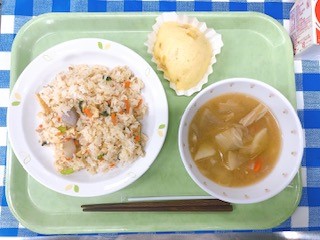 全国学校給食週間2日目は、大正時代の給食を再現します。この時代の給食は、明治時代よりも栄養バランスが考えられた献立が多くなりました。中でも、五目ごはんや栄養みそ汁は、よく食べられていた給食と言われています。どちらも一つの料理に、いろいろな食材が入っているので栄養満点です。