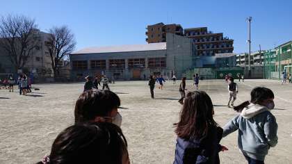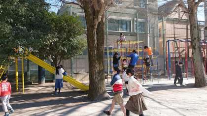 天気がよくて青空が気持ちよいのですが、風は冷たい…そんな中子どもたちは、元気に校庭遊びをしています。
