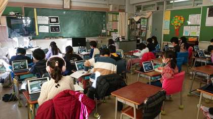 1組と3組は大型拡大機につないだり、各自の学習用タブレット端末を活用しています。もちろん自宅で学習している子どもも自身の学習用タブレット端末を活用しています。