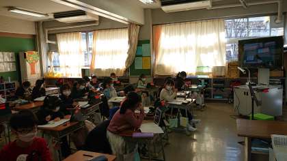 2組での対面授業を1組と3組と自宅で学習している子どもたちへ配信しています。