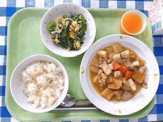 今日はほっこりとする優しい味わいの煮物をつくりました。鶏肉、大根、さといも、にんじん、こんにゃく、すべて硬さが違うので、しっかりと柔らかくなり味が染み込むように、調理員さんが工夫してつくってくれました。やわらかい大根やほくほくねっとりしたさといもなどのおいしさを味わってください。