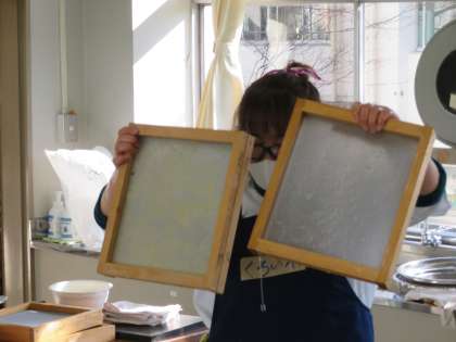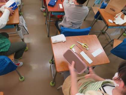 今日の4年3組は、伝統工芸教室の出張授業がありました。漉いた紙でしおりを作ったり、和紙の作り方を学んだり、紙すき体験したりしました。