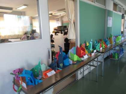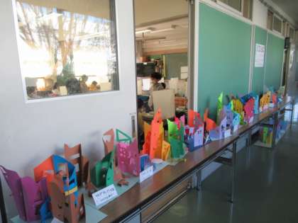 完成した作品を廊下の展示コーナーに展示しました。友達の作品を鑑賞し、お互いの作品のよさや頑張りについて確認していきます。