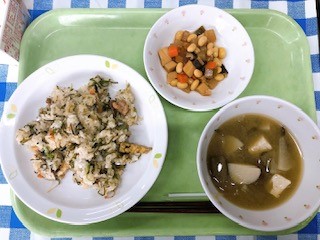 明日は節分ですね。今日は1日早く節分給食をつくりました。節分には、その年の恵方をむいて恵方巻を食べたり、豆まきをしたり、鬼が嫌がるいわしを飾ったりする風習があります。給食では、大豆をつかった五目豆と、いわしのつみれ汁をつくりました。豆は自分の歳の数より1個多く食べるとよいと言われています。しっかり食べて、今年1年間がよい年になるよう願いましょう。