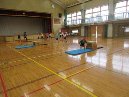 校庭では1組と2組が、鬼遊びなどをして体を温めた後、いろいろな器具や材料を置いて走るコースを友達と考え、自分のタイミングや跳び方を工夫して「跳の運動遊び」を楽しんでいました。体育館では3組が予備的な運動で体を温めた後、みんなで跳び箱・マット・踏み切り板を準備して、「跳び箱を使った運動遊び」を楽しんでいました。