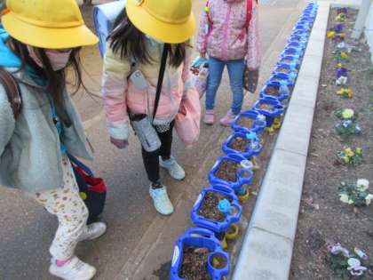 寒さの厳しい中ですが、土の表面に出てきている芽を観察して「チューリップの芽が出ているよ。」「まだの友達もたくさんだよ。」「寒いのにすごいな。」などの感想が届いています。12月に自分で球根を植えたこともあり、興味・関心をもって観察を続ける1年生のみなさんです。