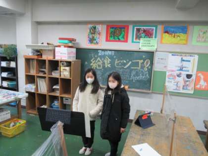 前もって配られたビンゴシート(教室によっては黒板に書いたシート)に、今回は給食で学級で人気のあるメニュー(または全校で人気があると思われるメニュー)を記入しておき、司会を務める集会委員さんが指名した学級がメニューの中から1つ発表し、全学級でビンゴゲームを楽しみました。シートに記入したメニューが発表されたり、リーチになったり、そしてビンゴになったりした教室からは、歓声が沸き起こったりしていました。