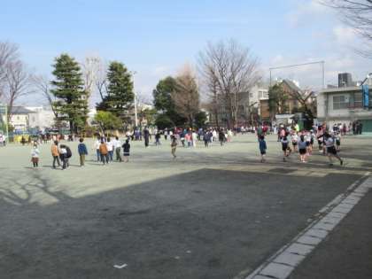 今回の元気タイムでは、感染対策の観点から比較的に軽い運動として全員で行う「長縄跳び」のみを、校庭・体育館・屋上の3か所に分散して行いました。体育館では6年生が、南校舎屋上では2年生が、北校舎屋上では1年生が、そして校庭では3年生・4年生・5年生が各学級ごとに長縄跳びをして、体を動かしました。