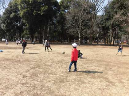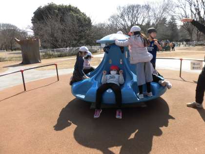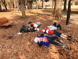 砧公園に着いてからは、それぞれ好きな遊びをしました。備え付けられた遊具、学校から持ってきたボール、大繩、フリスビーなどを使い、仲良く遊びました。また、落ち葉に埋もれ、自然と戯れる子どもたちもいました。