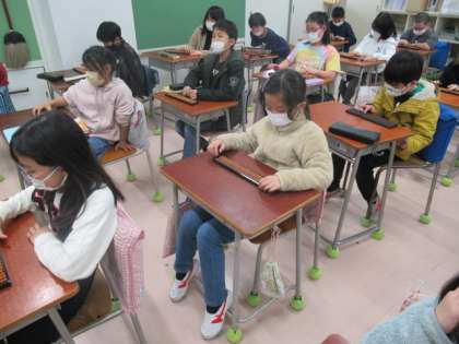 算数「そろばん」の学習をしました。2回ほどの学習なので、そろばんに親しむことが中心になります。今日は、1、そろばんのよさって何だろう。2、今の算数と違うことや同じことは何だろう。を考えながら、そろばんに触れました。「難しいな。」「意味が分からないよ。」「親指と人差し指を使うのか。」と、ひとりごとを言いながら練習していました。