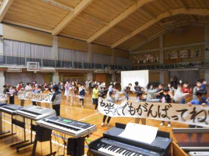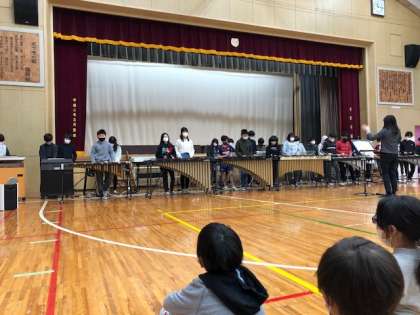 また、6年生の発表で合奏を見ました。様々な楽器を使っての合奏に子どもたちの目はくぎ付けでした。